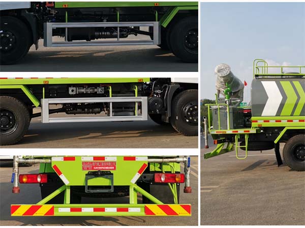 其它 | ABS型號:3631010-C2000,VIE ABS-Ⅱ;ABS生產(chǎn)企業(yè):東科克諾爾商用車制動系統(tǒng)(十堰)有限公司,浙江萬安科技股份有限公司;選裝描述:隨底盤選裝駕駛室,選裝不帶噴霧機組后平臺;側(cè)后防護(hù)情況:均采用Q235B材質(zhì),均采用螺栓連接,后下部防護(hù)尺寸:150×50(mm),離地面高度450mm;罐體總?cè)萘?立方米):9.77立方米、罐體有效容積(立方米):9.31立方米,罐體尺寸(罐體長×長軸×短軸)(mm)為4300×2150×1480;專用功能及裝置:專用裝置:罐體、灑水泵和噴霧機組,主要用于路面灑水及園林綠化;不裝噴霧機組時,專用裝置為灑水泵和罐體;其他說明:整車長度(mm)/前懸(mm)的對應(yīng)關(guān)為:7985/1475,7830/1320,8025/1515;當(dāng)選裝帶噴霧機組時,整備質(zhì)量為6955kg,額定載質(zhì)量(kg)/準(zhǔn)乘人數(shù)(人)對應(yīng)關(guān)系為:8850/3,8915/2;當(dāng)選裝不帶噴霧機組時,整備質(zhì)量為6635kg,額定載質(zhì)量(kg)/準(zhǔn)乘人數(shù)(人)對應(yīng)關(guān)系為:9170/3,9235/2。僅采用發(fā)動機D4.0NS6B170,D4.0NS6B195,B6.2NS6B210,YCS04180-68,YCY30165-60:選裝罐體涂裝外觀,選裝前沖霧炮,選裝立式水冷霧炮機組、自流口和后對沖,選裝大平臺的高位花灑、臥式水冷霧炮機組,選裝霧炮樣式。選裝踏梯樣式,選裝塑料輪罩。 | ||